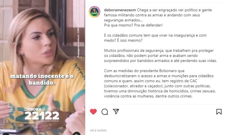 “Não aguento a hipocrisia de político e artista famoso que anda com segurança armada, mas é contra as armas” declarou Débora Menezes
