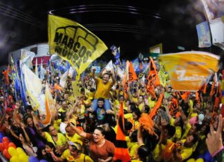 Avenida do Samba é tomada por ‘onda laranja’ em apoio à...