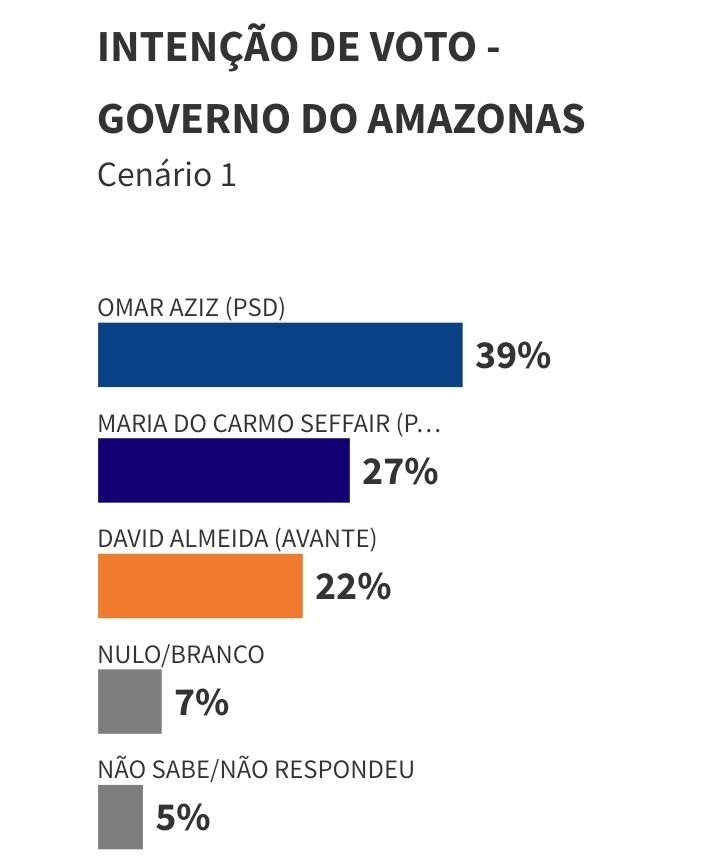 A primeira rodada de pesquisas da RealTime Big Data em 2026 (registro AM-00383/2026), divulgada nesta quinta-feira (19), aponta o senador Omar Aziz (PSD) na liderança das intenções de voto para o Governo do Amazonas. No principal cenário estimulado, Aziz aparece com 39%, seguido pela empresária Maria do Carmo Seffair (PL), que registra 27%, e pelo prefeito de Manaus, David Almeida (Avante), com 22%.