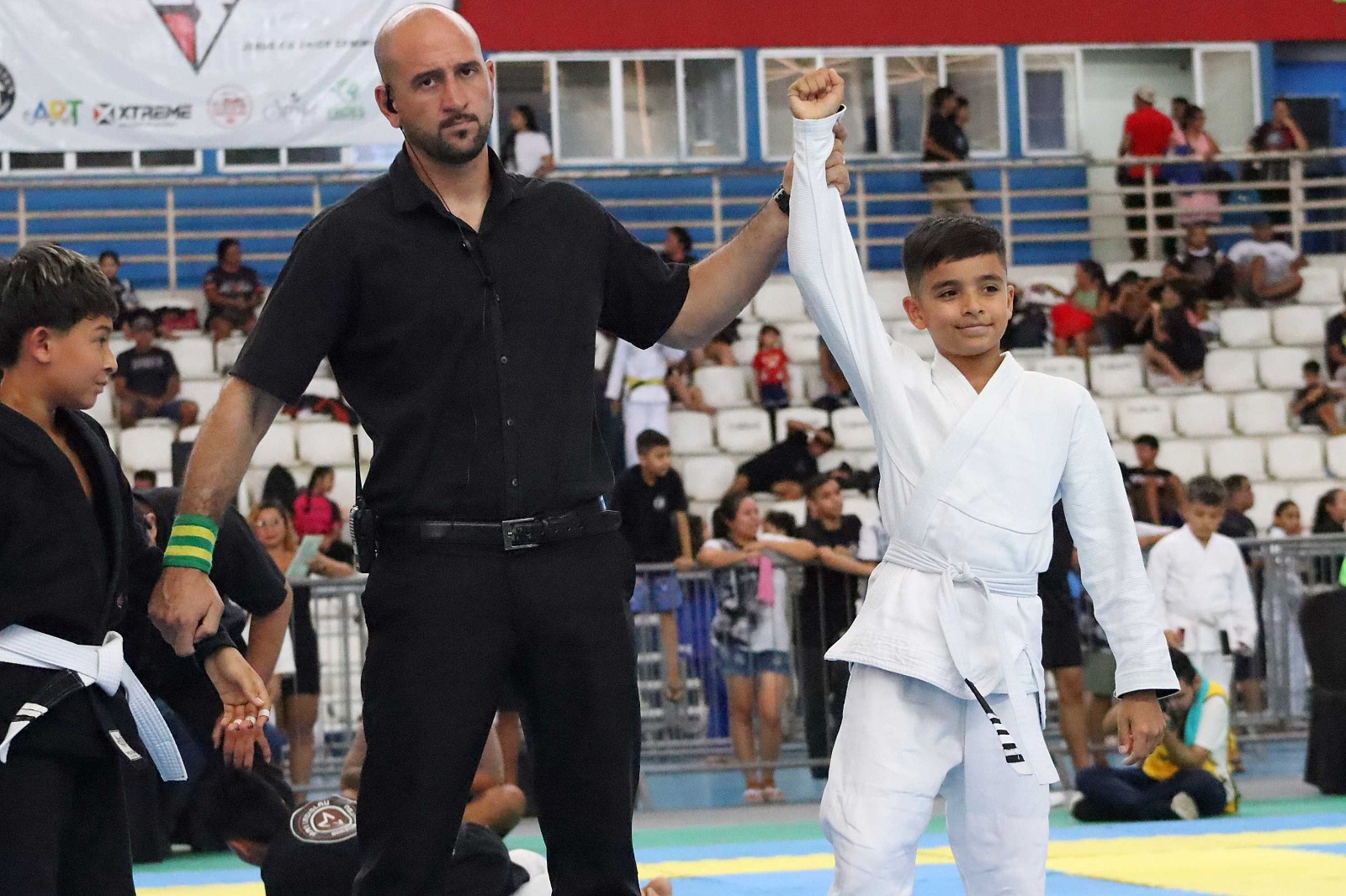 Recentemente, ele também começou a praticar jiu-jítsu. No Nordeste organizado pela FAJJE, o pequeno guerreiro competiu no Masculino Infanto Juvenil Branca Pluma, na modalidade Gi (com quimono). A chave foi composta por seis atletas e Mateus foi dominante nos três combates no tatame da Arena Amadeu Teixeira.