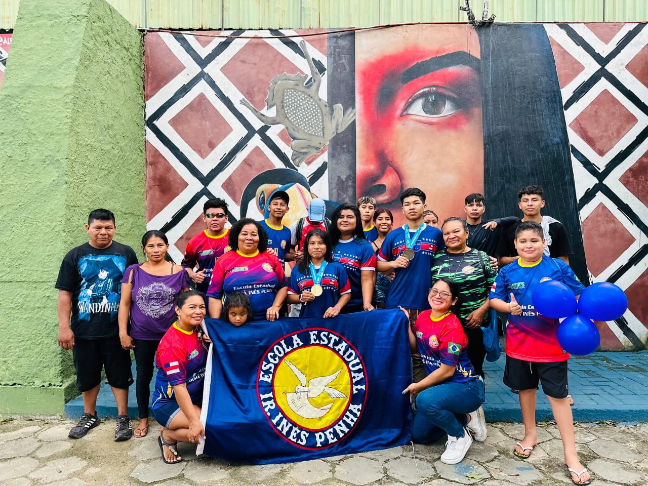 Já na tarde desta segunda-feira, Juliana foi recebida no ginásio da escola com a presença das turmas e membros da comunidade escolar. Além das parabenizações pela conquista da estudante, que é indígena do povo Yanomami, a comemoração contou com a entrega, para campeã, de um certificado da Fundação Nacional dos Povos Indígenas (Funai) e a apresentação do grupo de capoeira da região, quadrilha, dança das agremiações e de outros projetos do município.