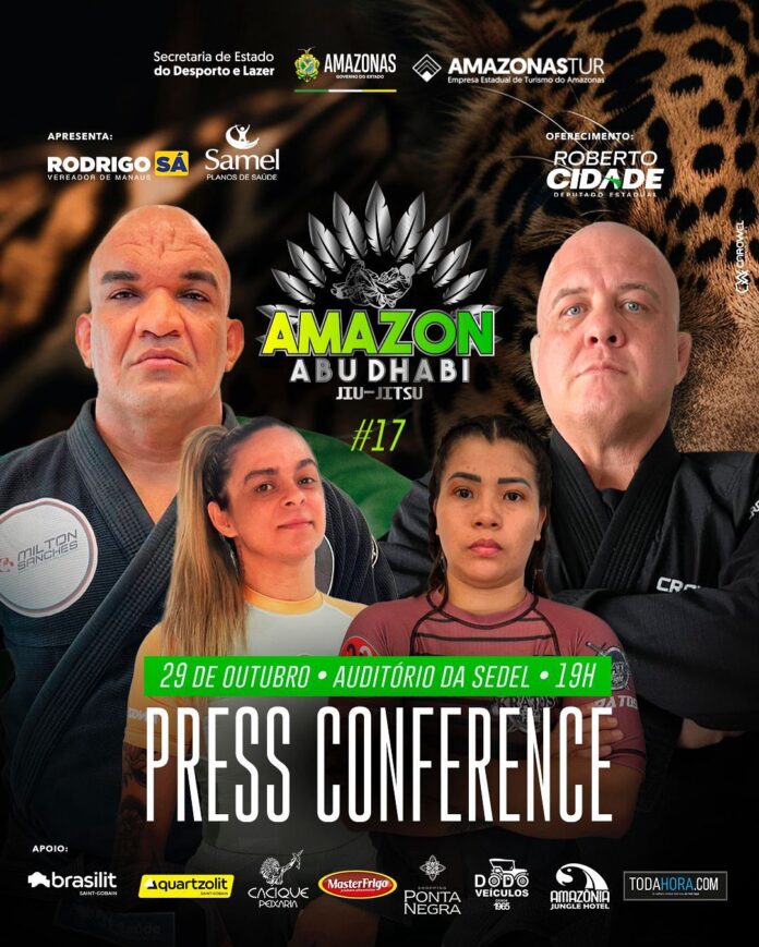 Organizado por Robert Pato, o Amazon Abu Dhabi Jiu-Jítsu, que chega a 17ª edição no dia 29 de novembro, no Centro de Convenções Vasco Vasques, realizará a coletiva de imprensa para apresentação dos principais atletas do card, além do sorteio do GP da categoria Adulto Masculino até 90 kg.