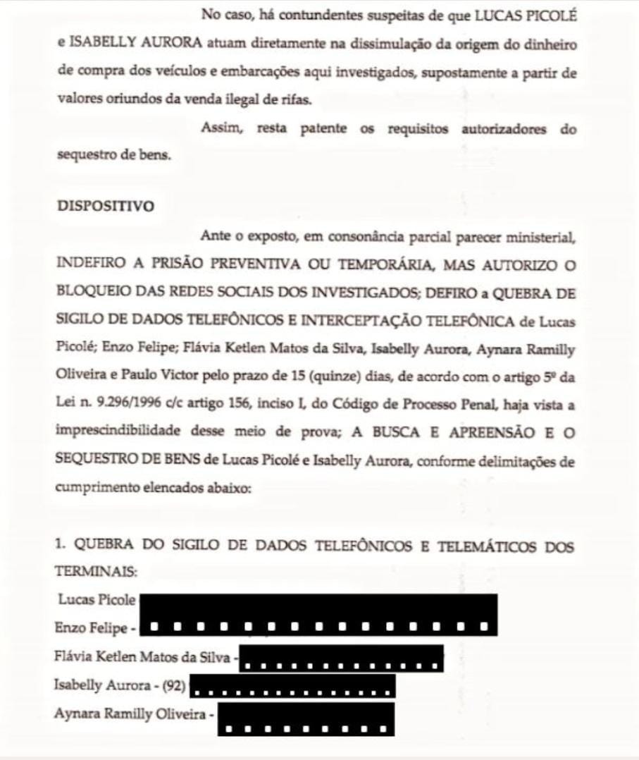 A ex-namorada do blogueiro Lucas Picolé, Aynara Ramilly, teve as redes sociais bloqueadas pela Justiça do Amazonas após ser acusada de ser a laranja dos esquemas de rifas ilegais. O bloqueio faz parte das investigações da Operação Dracma, que pegou conversas comprometedoras envolvendo o nome dela.