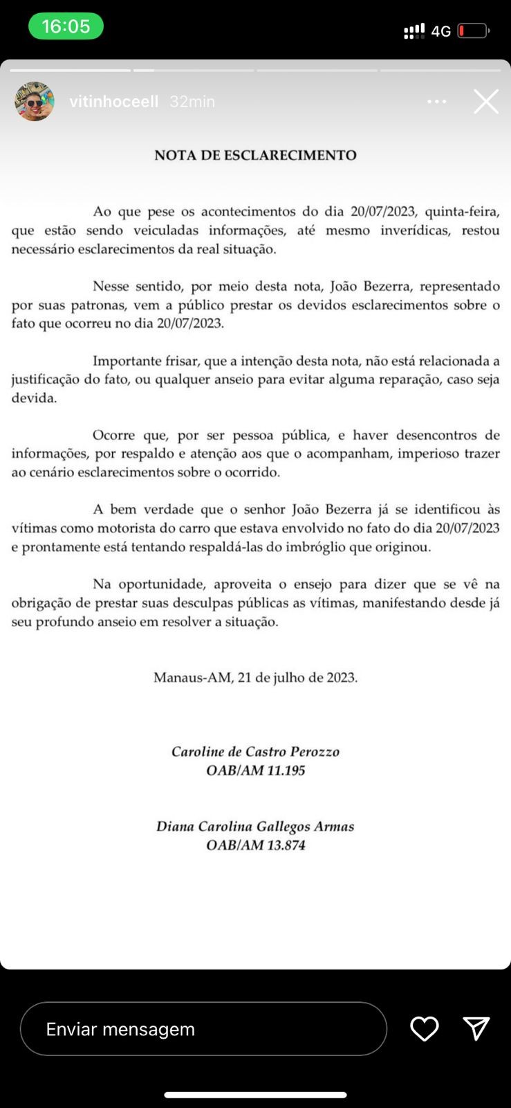 Em seus stories, ele publicou um documento, escrito por suas advogadas, onde começa, novamente, afirmando que as notícias veiculadas na mídia, de que ele teria atropelado um casal de motociclista são inverídicas, mas por fim termina a nota confessando que foi ele quem causou o acidente, ao entrar na contramão em alta velocidade, atingir o casal de frente e fugir sem prestar socorro, como mostra o vídeo no fim da matéria.
