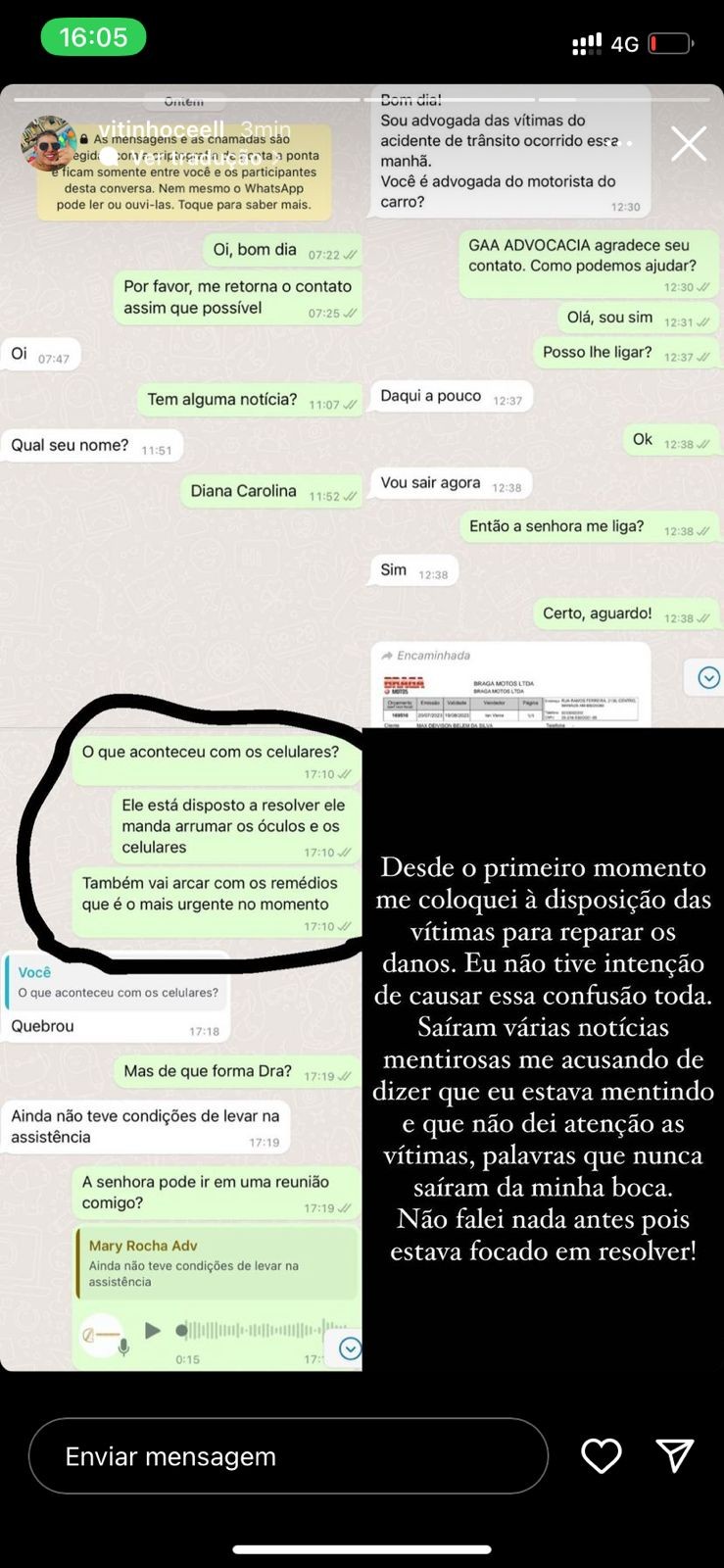 João Victor ainda pede desculpas pelo ocorrido, e diz que está prestando suporte financeira as vítimas, para compravar ele chegou a postar conversas de WhatsApp, mas são apenas pedidos da advogada dele em conversar com a defesa das vítimas e se oferecendo para consertar os celulares e óculos que foram danificados durante o atropelamento, e pagamento de remédios.