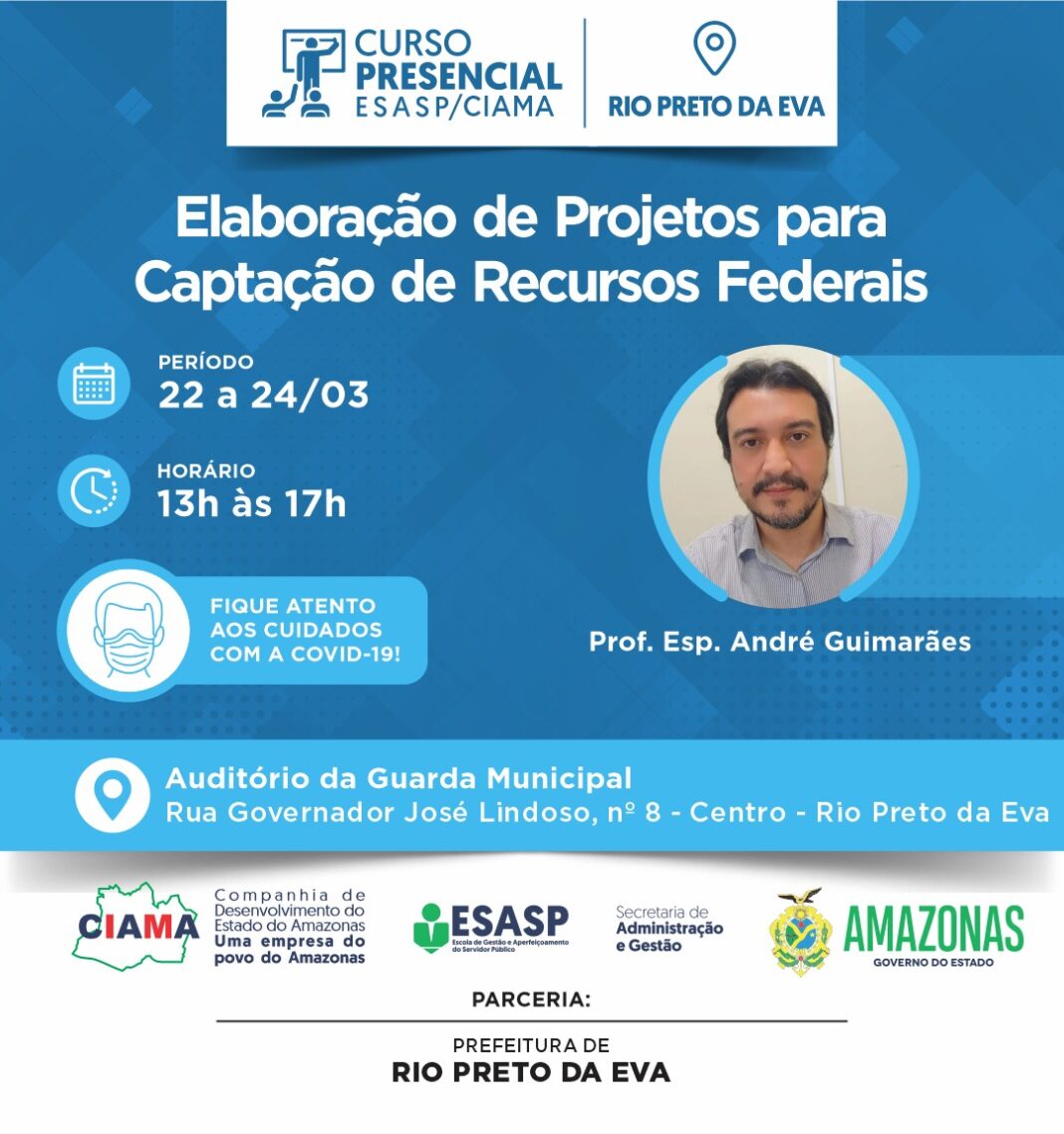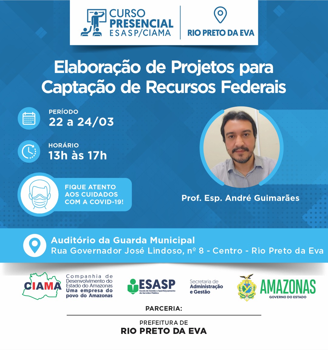 Em uma oportunidade inédita, o Governo do Estado oferecerá, no período de 22 a 24 de março, em Rio Preto da Eva, o curso de Elaboração de Projetos para Captação de Recursos Federais, com o objetivo de preparar agentes públicos para a captação de recursos por meio da Plataforma +Brasil, o Portal dos Convênios Siconv.