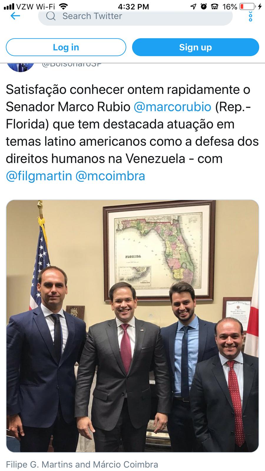 Em sua rede social, Eduardo Bolsonaro informou que se encontrou com Giuliani e disse que sua experiência em ter salvo NY da criminalidade – cidade tida como caso perdido pelos americanos nos anos 90 – vai ao encontro “ao que pensamos para o Brasil: tolerância zero no combate ao crime”.