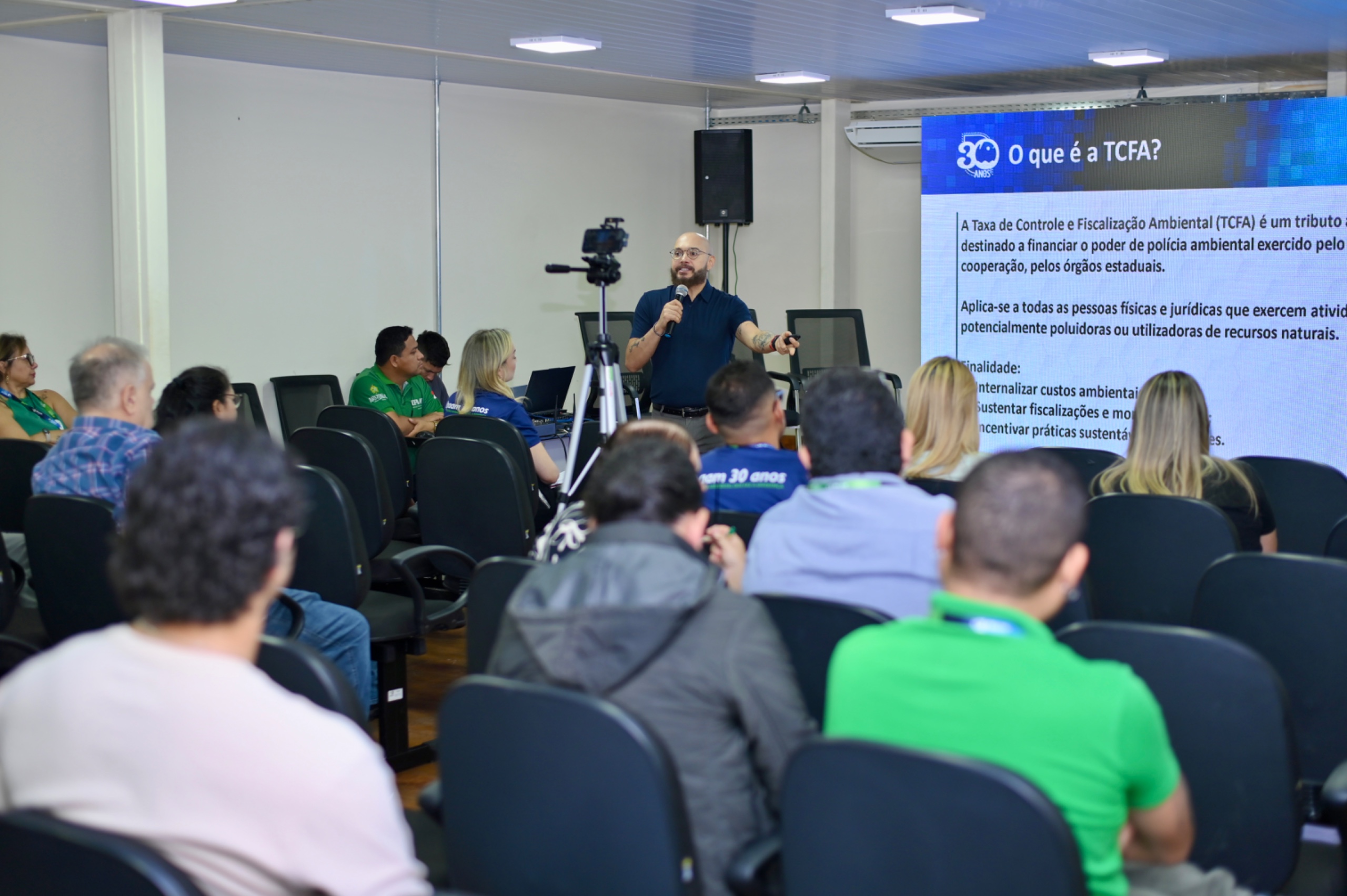 Das 9h às 11h30, no Auditório do Centro de Monitoramento Ambiental e Áreas Preservadas (Cmaap), ocorreu a capacitação “Conceito, importância, aplicabilidade e cobrança da Taxa de Controle e Fiscalização Ambiental (TCFA) ”, ministrada pelo analista ambiental da Diretoria Técnica (DT) do Ipaam, Sheron Vitorino.