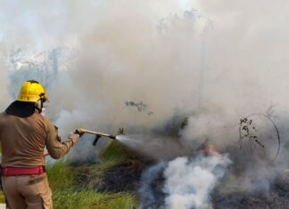 Corpo de Bombeiros combate incêndio em área de vegetação nas proximidades...
