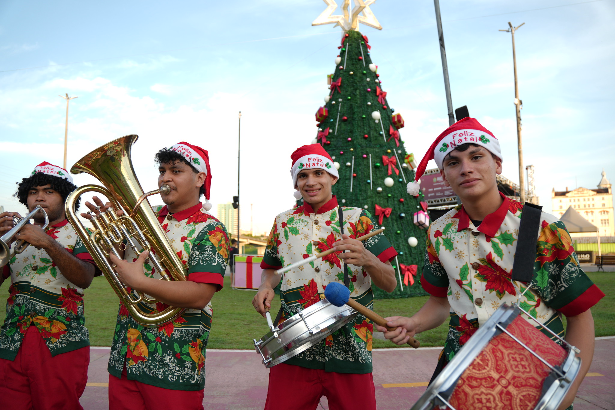 O evento começou às 17h, com a Fanfarra da Companhia Trilhares, conduzindo o público pelo parque ao som de um repertório que mesclou músicas infantis tradicionais e canções natalinas.
