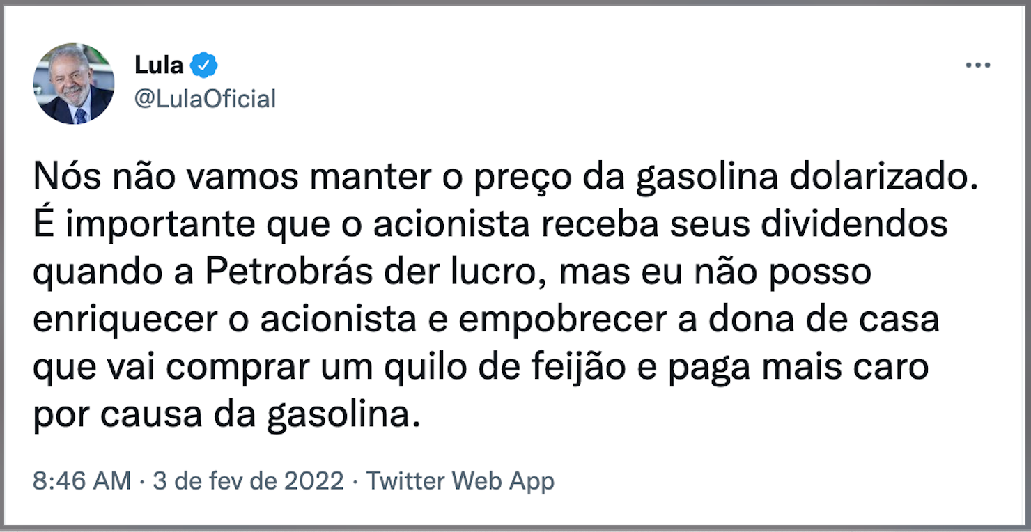 O amor venceu, então faz U L. Em reunião realizada no Palácio do Planalto, em Brasília, o presidente Luiz Inácio Lula da Silva (PT) decidiu, com sua equipe, voltar a partir de março com a cobrança de 75% de tributos sobre a gasolina e de 21% sobre etanol.