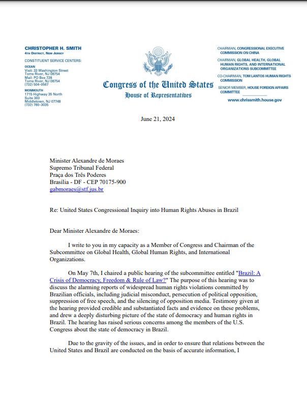 A carta foi enviada pelo congressista Christopher H. Smith, presidente da Subcomissão de Saúde Global, Direitos Humanos Globais e Organizações Internacionais.
