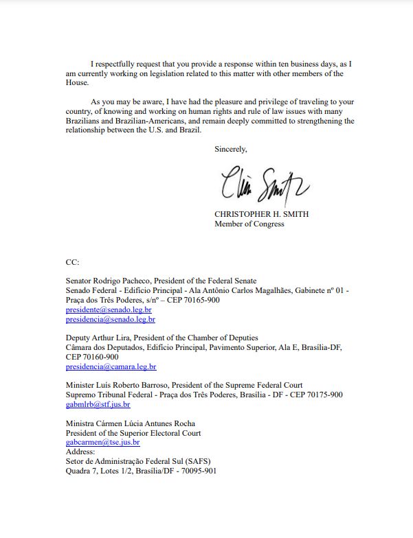 Smith afirma estar trabalhando em uma legislação relacionada a essas questões com outros membros da Câmara dos Representantes, ressaltando a urgência da resposta solicitada. Ele também enfatiza seu compromisso em fortalecer as relações entre os Estados Unidos e o Brasil.