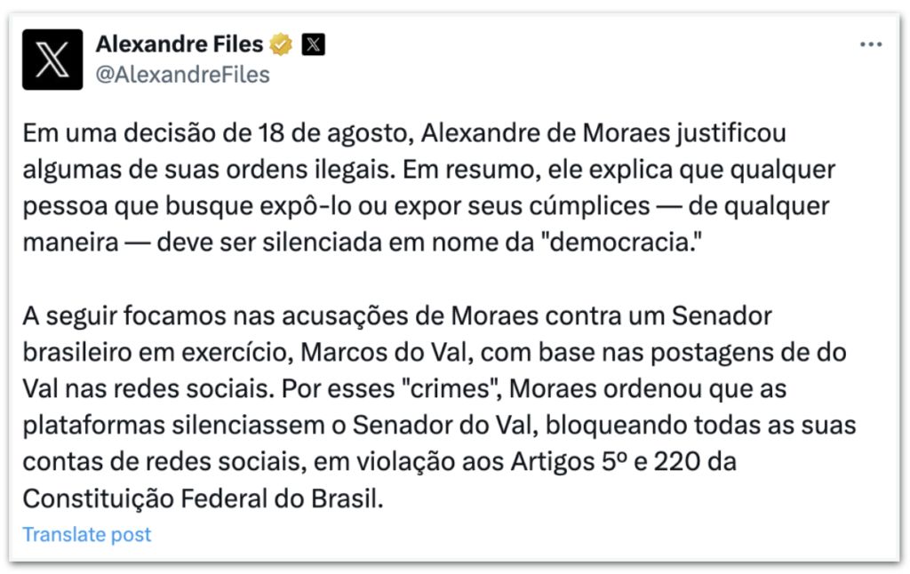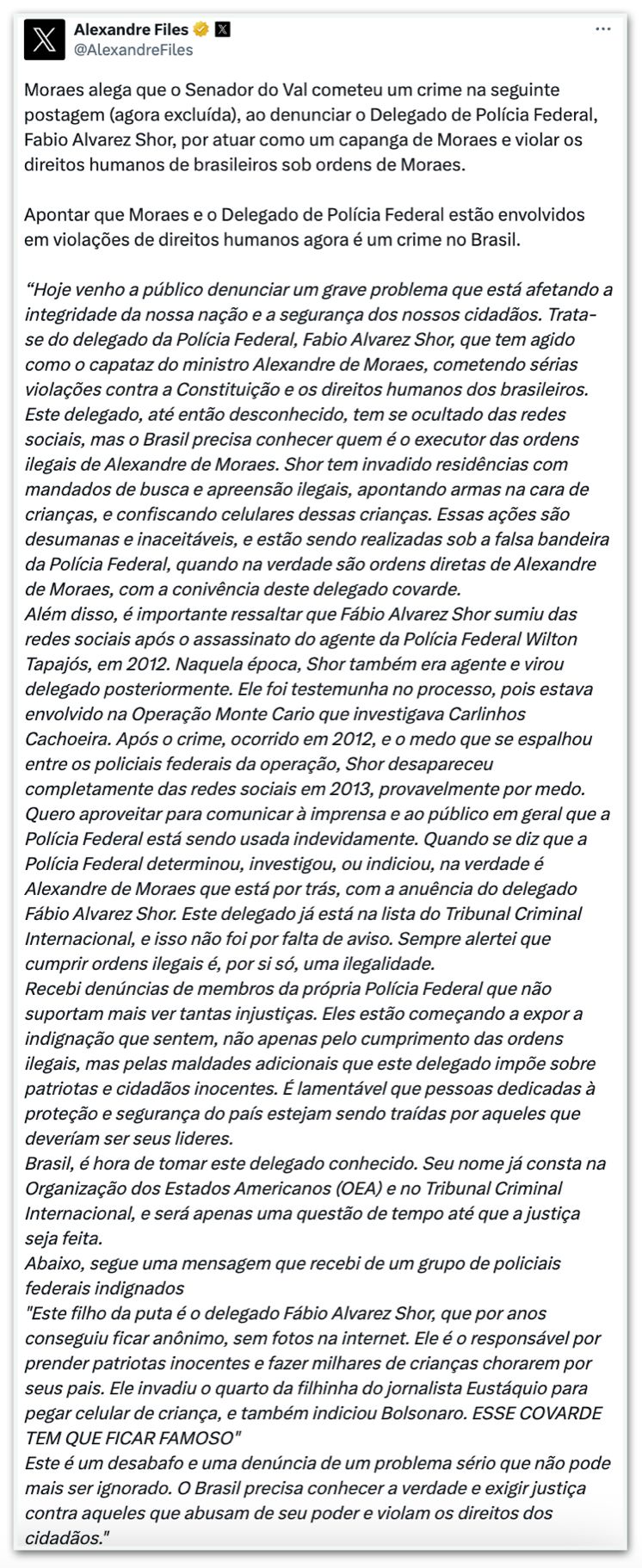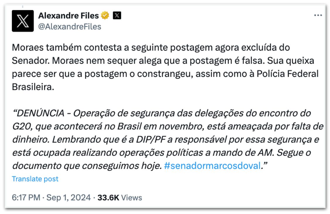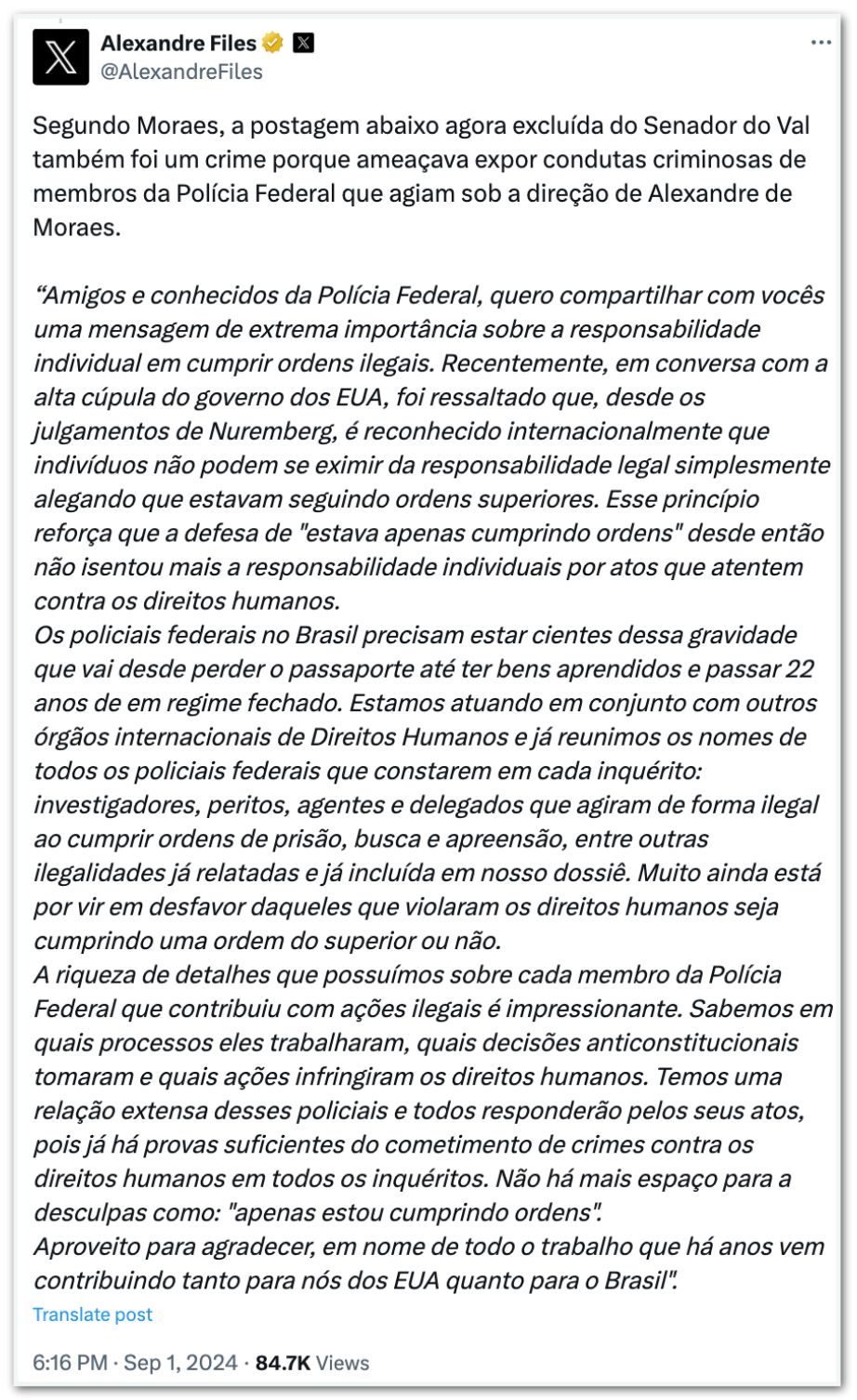 DestaquesJustiçaPolíticaO X foi derrubado por Alexandre de Moraes para calar um Senador da República e por expor a coitadinha da PF, revela Elon Musk 1 de setembro de 2024CompartilharFacebookTwitterPinterestWhatsAppEmailTelegram E o covarde Senado não fará nada, revela Ronaldo Aleixo do Portal Chumbo Grosso. O Xandão quer calar a todos que proferirem críticas ao STF e ponto final.