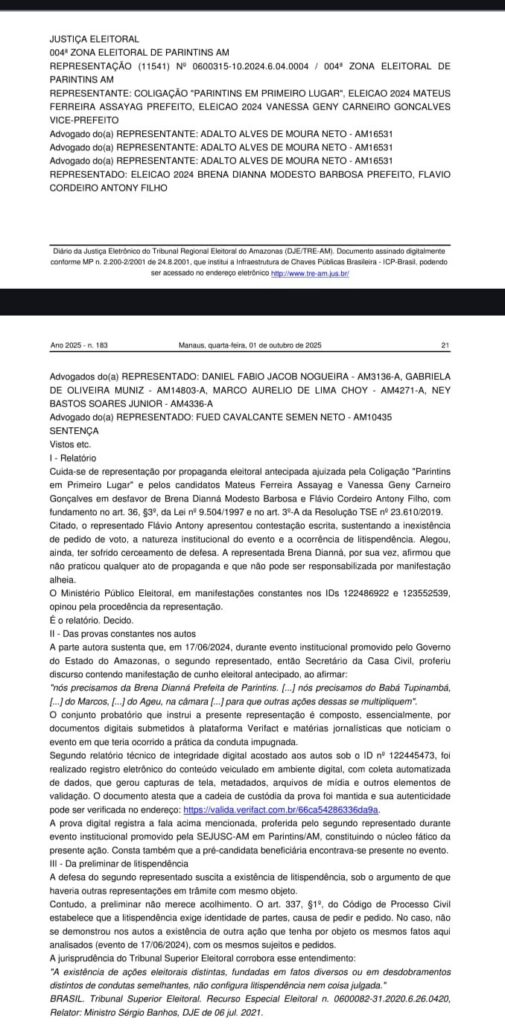 O Juízo da 4ª Zona Eleitoral de Parintins (AM) proferiu decisão condenando a então pré-candidata a Prefeita Brena Dianná Modesto Barbosa e seu apoiador Flávio Cordeiro Antony Filho por prática de propaganda eleitoral antecipada irregular.