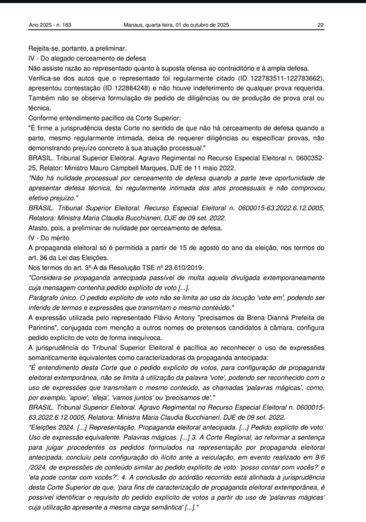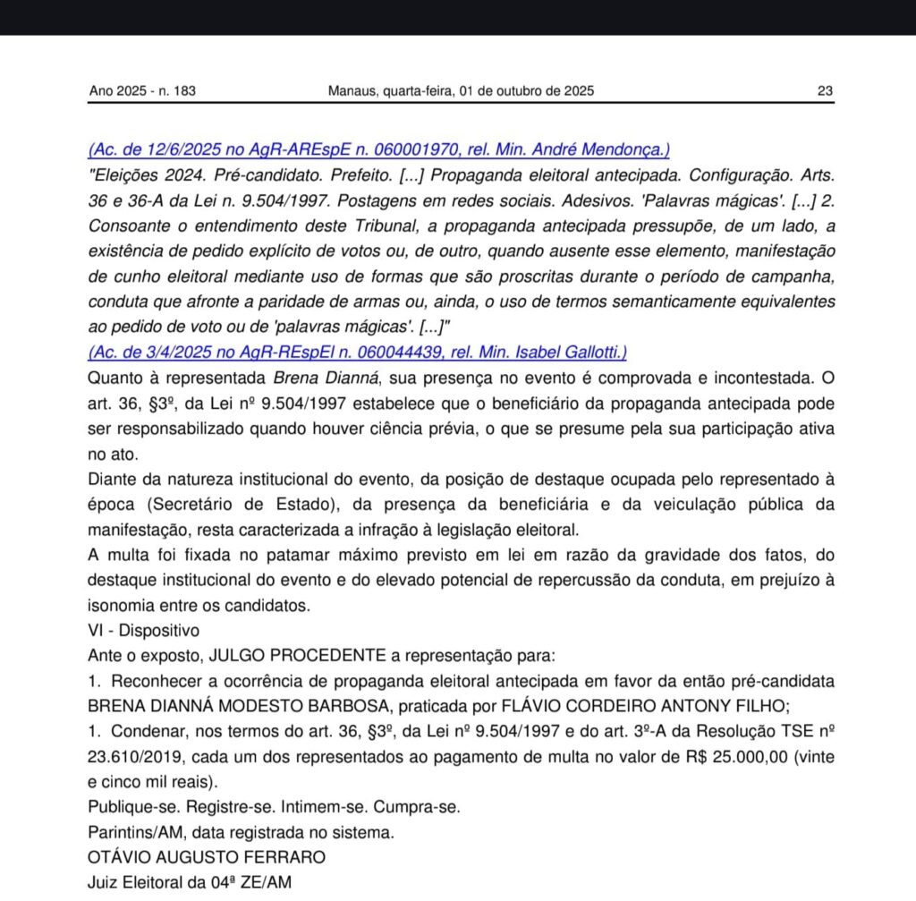 A decisão se deu em uma representação movida devido à manifestação de Flávio Antony em um evento, na qual ele utilizou a expressão “precisamos da Brena Dianná Prefeita de Parintins”.