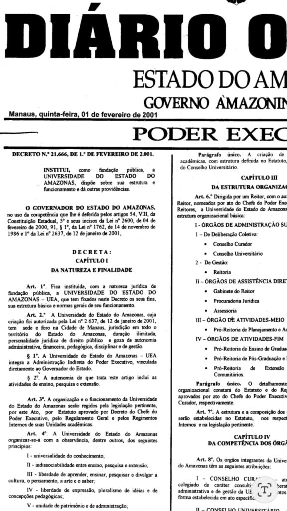 Em 1º de fevereiro de 2001, o Diário Oficial do Estado publicou o Decreto número 21.666, daquela data, assim ementado: “INSTITUI, como fundação pública, a UNIVERSIDADE DO ESTADO DO AMAZONAS, dispõe sobre sua estrutura e funcionamento e dá outras providências.” Há 24 anos!