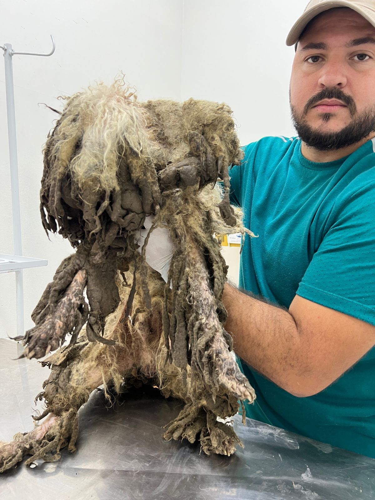 As equipes do instituto chegaram até a casa após denúncias de moradores, que começaram a ouvir os gritos de sofrimento do animal. O cachorro estava escondido por cima de um pelo que não era tosado há anos. Além disso, ele está tão debilitado que não consegue mais ficar em pé.