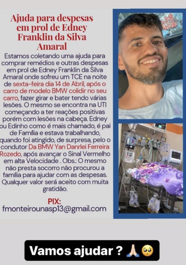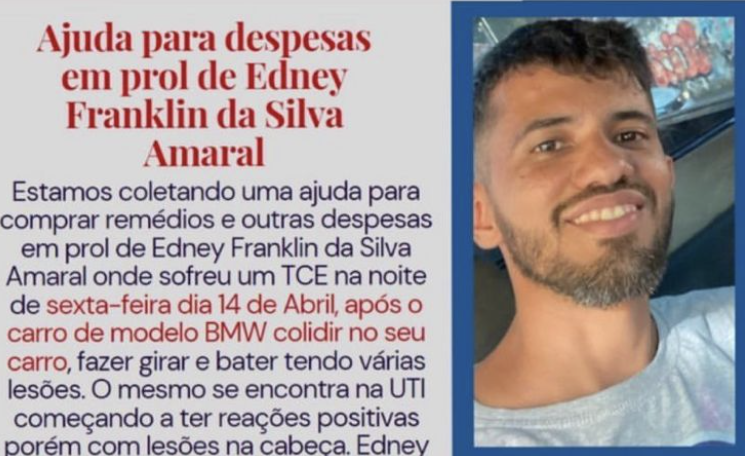 Familiares do motorista de aplicativo Edney Franklin da Silva pedem ajuda nas redes sociais para custear o tratamento do rapaz. Ele é quem dirigia um veículo que foi batido pelo tenente do Exército Yan Danrlei Ferreira Rozendo, de 28 anos, no Centro de Manaus, na última sexta-feira (14). No acidente, Edney e a passageira, uma jovem de 18 anos, foram arremessados para fora do carro. Ela morreu na hora.