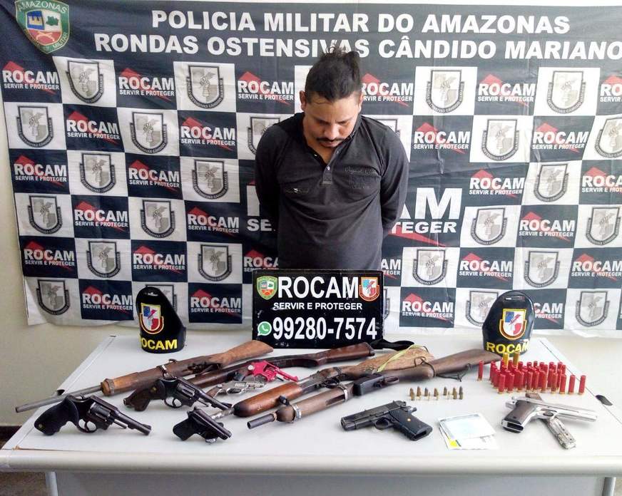 Apontado com um dos líderes da facção criminosa Família do Norte, Antônio Marcos Pereira, 38, vulgo “Capucho”, foi preso com 11 armas de fogo no km 42 da estrada de Novo Airão, nesta sexta-feira (18), durante a operação integrada “Laborum Meta”, da Secretaria de Segurança Pública (SSP-AM). Ao todo, 17 pessoas foram presas, outras três foram indiciadas e um menor foi apreendido na ação.