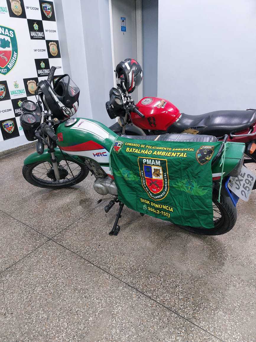 Por volta das 18h40, a viatura ambiental recebeu informação via rede de rádio, relatando que uma motocicleta, Honda Titan 125, de cor verde, e placa JXE 2593, estava trafegando pela avenida Autaz Mirim com a placa de identificação clonada.