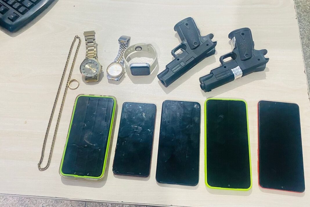 Durante patrulhamento, por volta das 16h30, a equipe da viatura 7218 avistou uma moto sem placa com três ocupantes. Eles foram abordados na avenida Francisca Mendes, e com eles os policiais apreenderam quatro celulares da marca Samsung; um celular da marca Poco; dois simulacros de arma de fogo; e a motocicleta Honda 125, de cor prata, sem placa.