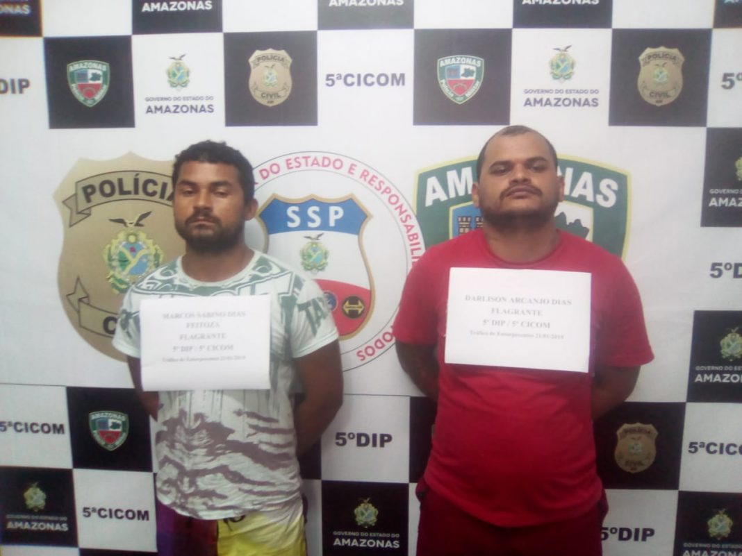 A Polícia Civil do Amazonas, por meio da equipe de investigação do 5º Distrito Integrado de Polícia (DIP), sob o comando da delegada Déborah Barreiros, titular da unidade policial, em ação conjunta com policiais militares lotados na 5ª Companhia Interativa Comunitária (Cicom), prendeu em flagrante, na tarde de segunda-feira (21/1), por volta de meio-dia e meia, Darlison Arcanjo Dias, 28, e Marcos Sabino Dias Feitosa, 32. Com os infratores os policiais apreenderam, aproximadamente, um quilo de maconha, balança de precisão e dinheiro.