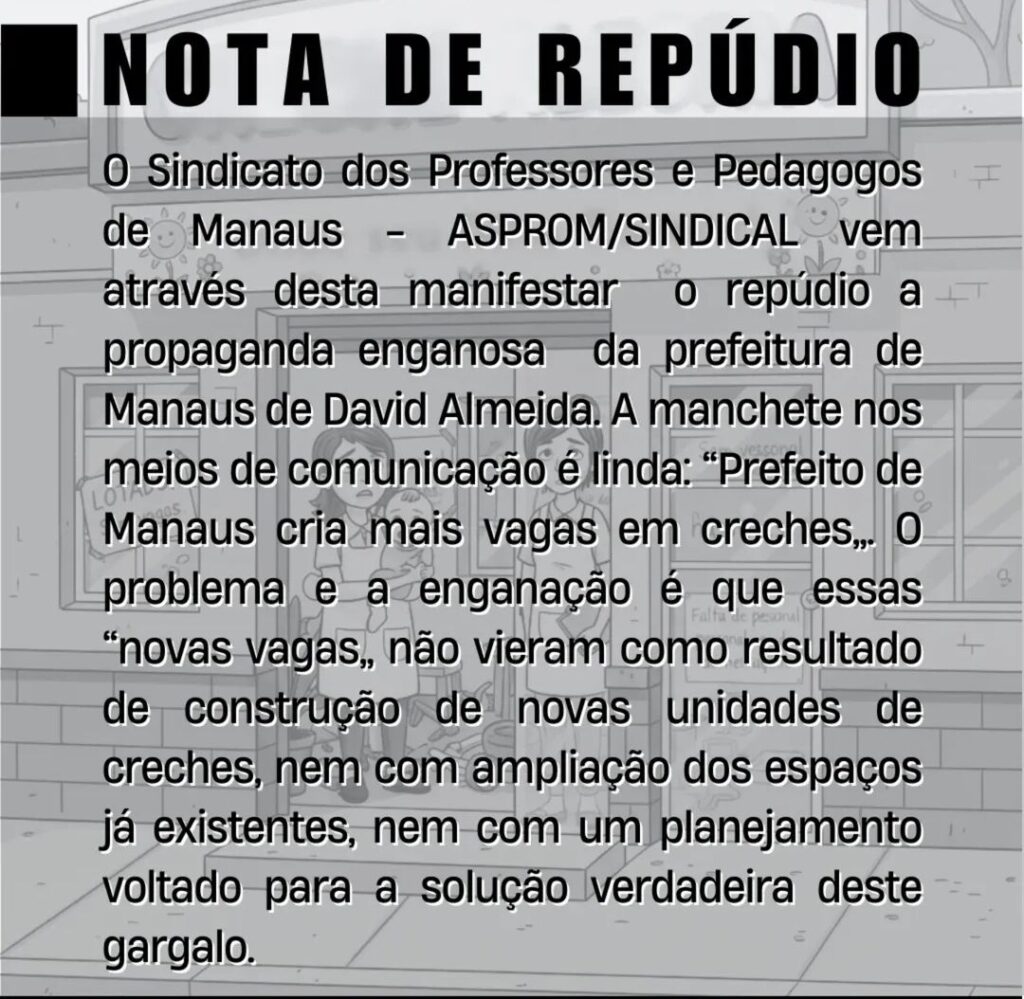 Enquanto as peças publicitárias da Prefeitura de Manaus celebram a expansão de vagas na educação infantil, os bastidores das creches municipais revelam uma estratégia baseada mais em “puxadinhos” estatísticos do que em investimento real. A denúncia parte do sindicato da categoria (AspromSindical), que acusa o prefeito David Almeida (Avante) de promover uma perigosa maquiagem de números através do Decreto nº 6.152.