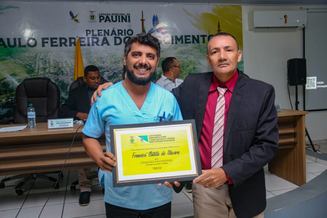 Na tarde desta segunda-feira (26/12), o Plenário da Câmara Municipal ficou repleto de admiradores, amigos e familiares do médico Francisco Batista de Oliveira, a quem foi outorgado o título de Cidadão Honorário de Pauini. Natural de Rio Branco no Acre, Dr. Francisco é especialista em Saúde da família e completa 3 anos de atuação profissional dedicada aos cidadão do município.