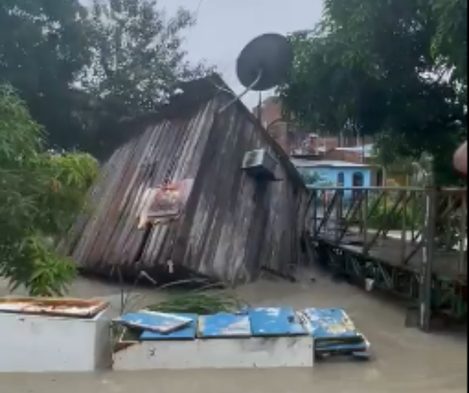 A força da água foi tanta que as estruturas foram levadas em questão de segundos. A casa é arrastada, mas parte ao meio ao bater em uma passarela de ferro que corta o igarapé.