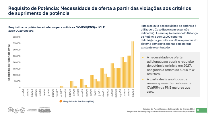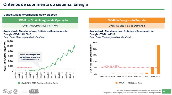 Assim, apenas 12 meses antes da falta de energia que está anunciando quase entre os dentes, a EPE sai do seu silêncio sepulcral e nos diz que “vai faltar energia em 2025”, como mostram as figuras abaixo do relatório da própria EPE indicando “início de violação dos critérios de risco máximo, elaborados para o Programa de Desenvolvimento de Energia Elétrica 2034, publicado no começo de julho.