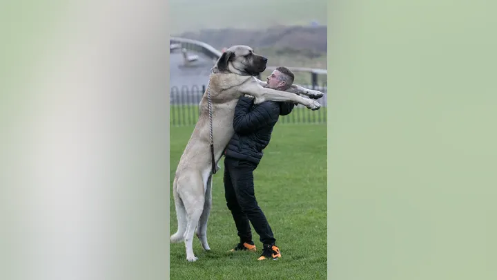 Shaw disse ao SWNS que seu canino “gigante gentil” pode ter mais de dois metros de altura e pesar cerca de 252 quilos comendo um frango inteiro diariamente.