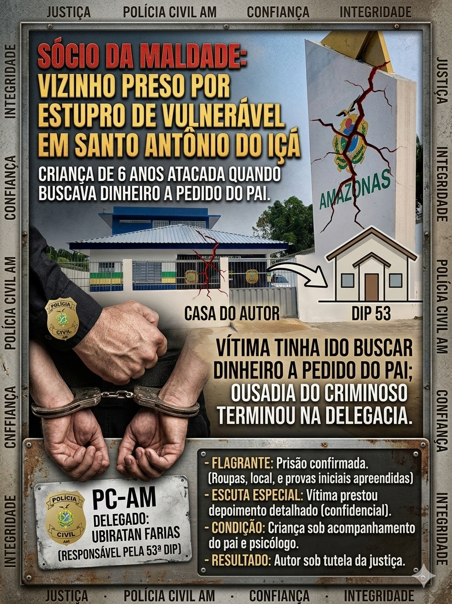 O “vizinho do mal” agora está isolado, à disposição da Justiça e responderá pelo crime de estupro de vulnerável. O clima na cidade é de indignação, e a polícia reforça que crimes contra crianças serão combatidos com o rigor máximo da lei.