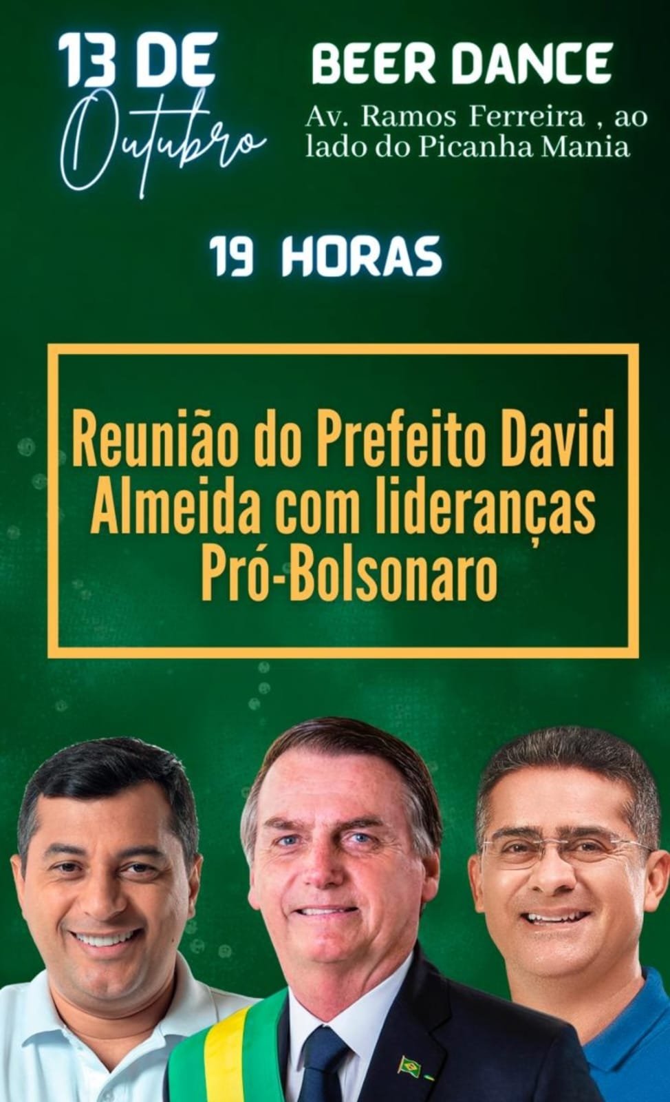 Movimentos de Direita abandonam Coronel Menezes e se unem ao prefeito de Manaus David Almeida, que reúne lideranças nesse momento no Beer Dance, para eleger o presidente Bolsonaro. Ao Portal, chegou informação de que David deverá ser o novo nome escolhido pelo presidente Bolsonaro e lideranças bolsonaristas no Amazonas.