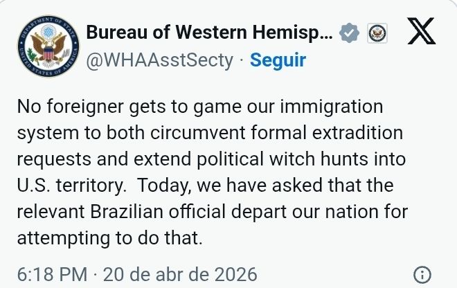 Nenhum estrangeiro pode manipular nosso sistema de imigração para contornar tanto pedidos formais de extradição quanto prolongar caças às bruxas políticas em território dos EUA. Hoje, solicitamos que o funcionário brasileiro relevante deixe nossa nação por tentar fazer isso.