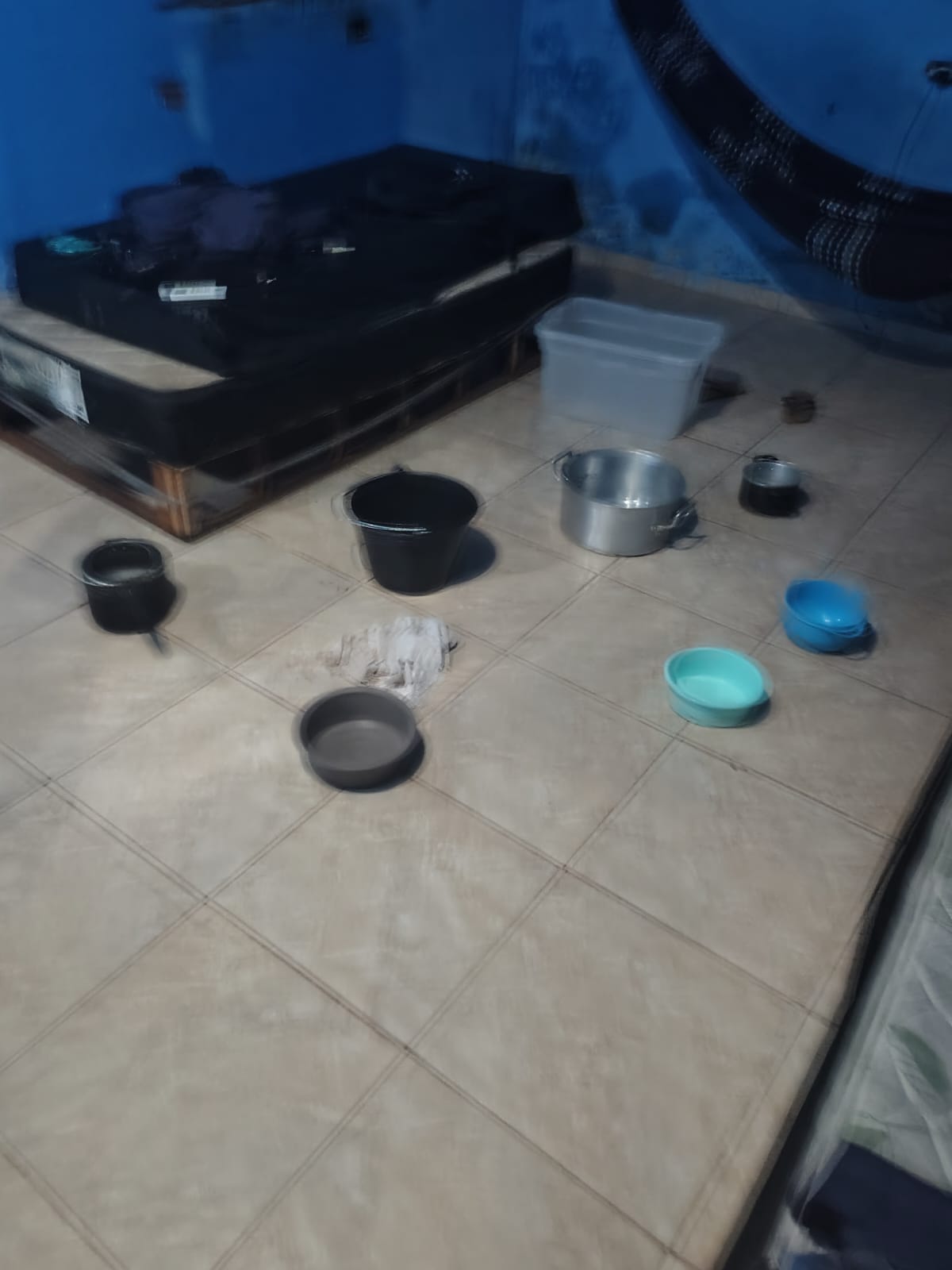 Vídeos e fotos registrados por quem vivencia o cotidiano da unidade mostram um cenário de completa insalubridade. O que deveria ser um quartel assemelha-se a uma estrutura em colapso: goteiras abundantes transformam o interior do prédio em uma extensão do temporal, forçando os policiais a utilizarem baldes, panelas e bacias espalhadas pelo chão para conter o alagamento.