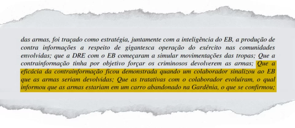 O inspetor disse que, alinhado com o Exército, usou uma tática de contrainformação e forneceu ao “colaborador” do Comando Vermelho informações sobre uma operação que aconteceria na Cidade de Deus, favela na zona oeste do Rio, onde estavam as armas. Em troca, as metralhadoras seriam devolvidas.