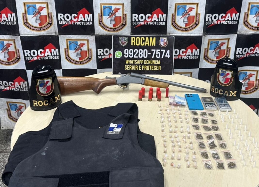 A Polícia Militar do Amazonas (PMAM), por meio das Rondas Ostensivas Cândido Mariano (Rocam), prendeu um homem, de idade não informada, em posse de arma de fogo, coletes balísticos e 116 porções de entorpecentes, na noite de segunda-feira (12/01), no bairro Tarumã, zona oeste de Manaus.