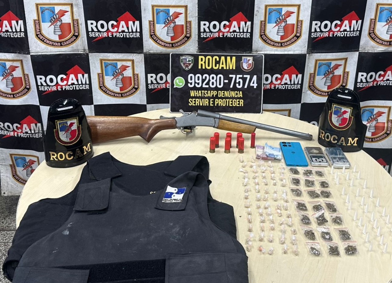 Em continuidade às buscas, o suspeito colaborou com a equipe da PMAM e indicou um local onde estavam escondidos uma espingarda calibre 12, munições e coletes balísticos. No total, foram apreendidos uma espingarda calibre 12, munições do mesmo calibre, uma munição calibre 28, dois coletes balísticos, 21 porções de maconha, 33 porções de cocaína, 62 porções de oxi, duas balanças de precisão e um aparelho celular.