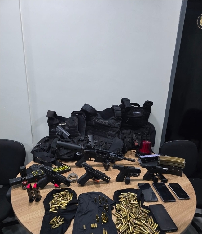 Além de entorpecentes, as autoridades apreenderam um arsenal que reforça o poder bélico do grupo. Entre os itens confiscados estão: