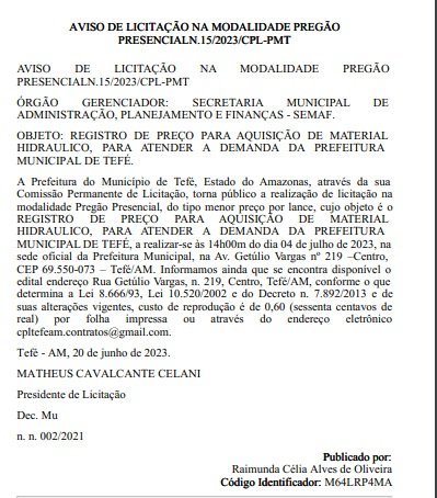 A Prefeitura de Tefé (a 522 quilômetros de Manaus), de responsabilidade do prefeito Nicson Marreira (União Brasil), através da sua Comissão Permanente de Licitação, tornou público a realização de licitação na modalidade Pregão Presencial, para aquisição de material hidráulico.