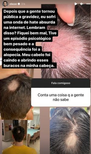 Recentemente, o ex-BBB Eliezer compartilhou nas redes sociais sobre a experiência que passou com a queda de cabelo consequente da alopecia. Ao responder uma caixinha de perguntas, o influenciador explicou que a condição ocorreu após um período turbulento de estresse durante o anúncio da gravidez de Viih Tube, em que ele lidou com uma onda de ódio na internet.