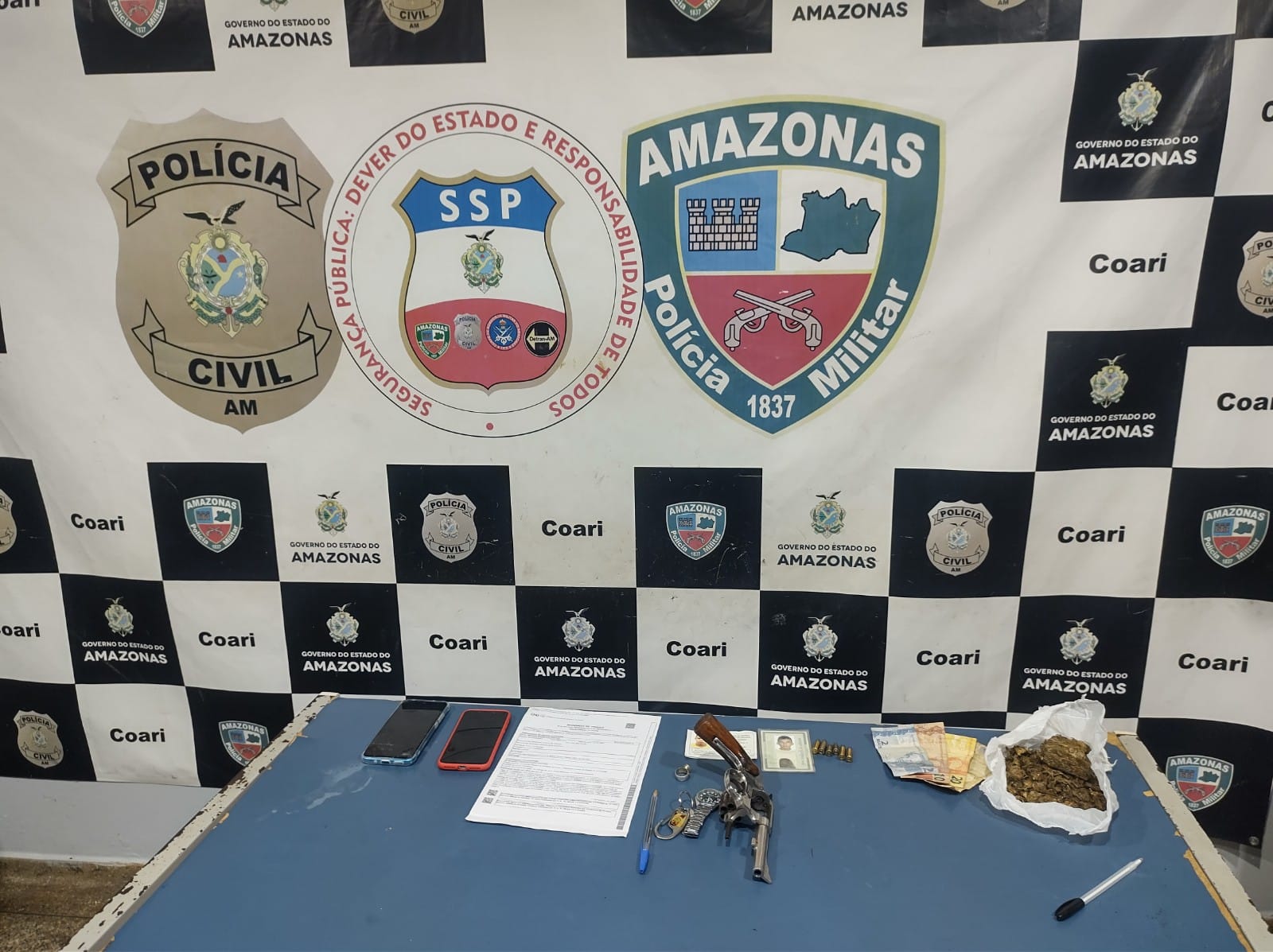 Dois homens foram presos, na tarde de quarta-feira (02/11), por policiais que atuam na Base Fluvial Arpão, no município de Coari (a 363 quilômetros de Manaus), em cumprimento a mandados de prisão pelo crime de homicídio. Ainda nos desdobramentos da ação, que ocorreu durante o cumprimento da operação Fronteira Mais Segura/Hórus, coordenada pela Secretaria de Segurança Pública do Amazonas (SSP-AM), foram apreendidas porções de drogas e uma arma de fogo.