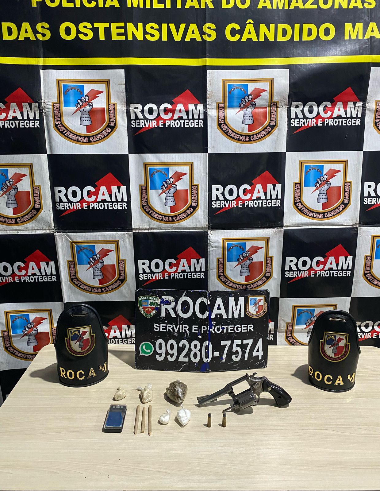 A Polícia Militar do Amazonas (PMAM), por meio das Rondas Ostensivas Cândido Mariano (Rocam), prendeu em flagrante, na tarde de quarta-feira (19/03), um jovem, de 18 anos, portando uma arma de fogo e em posse de entorpecentes no bairro Lago Azul, zona norte de Manaus.