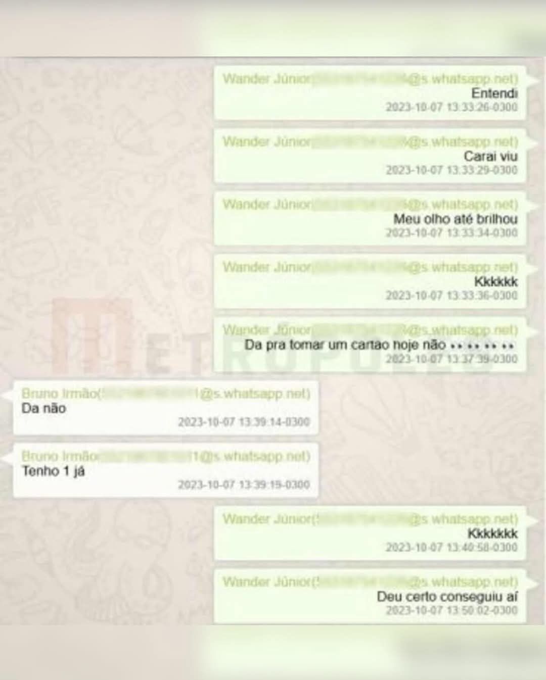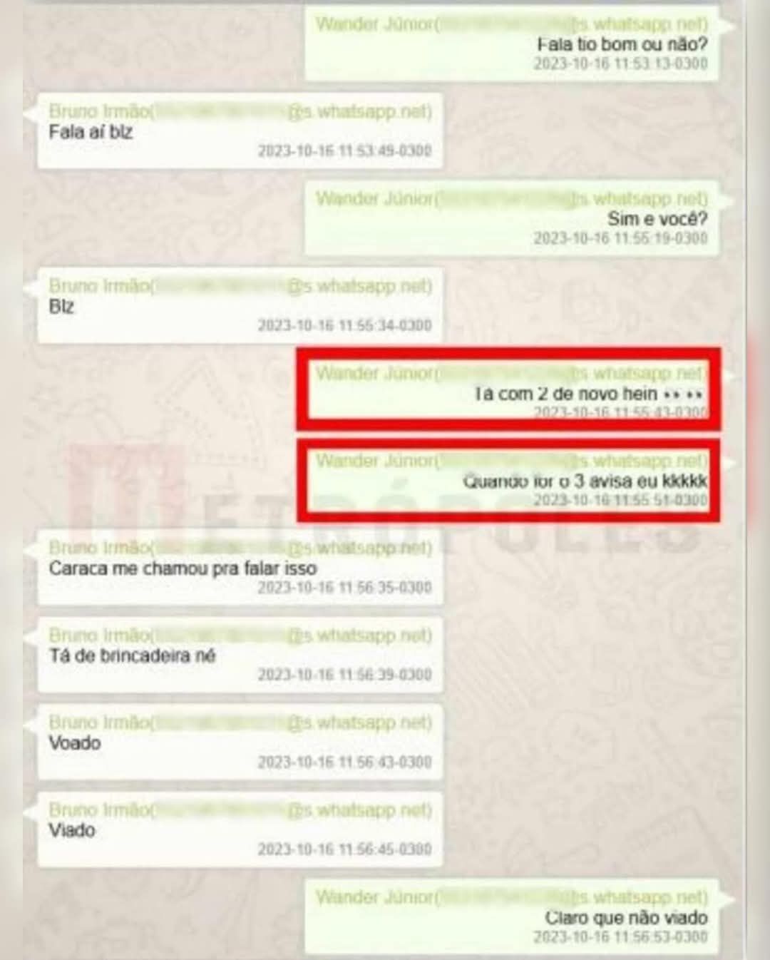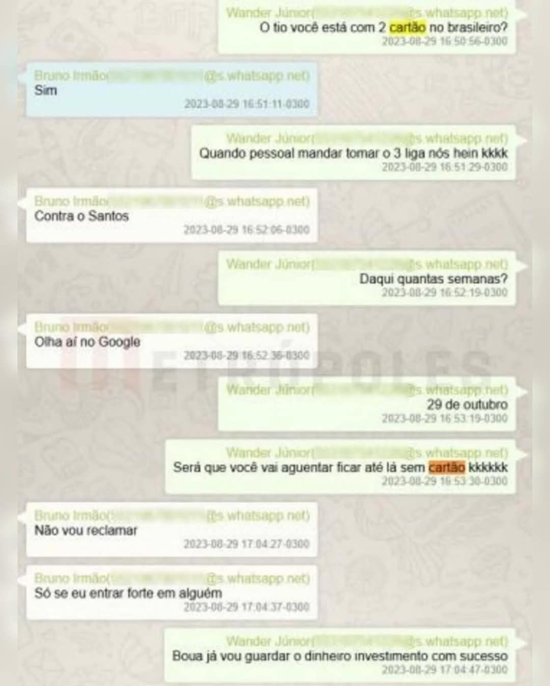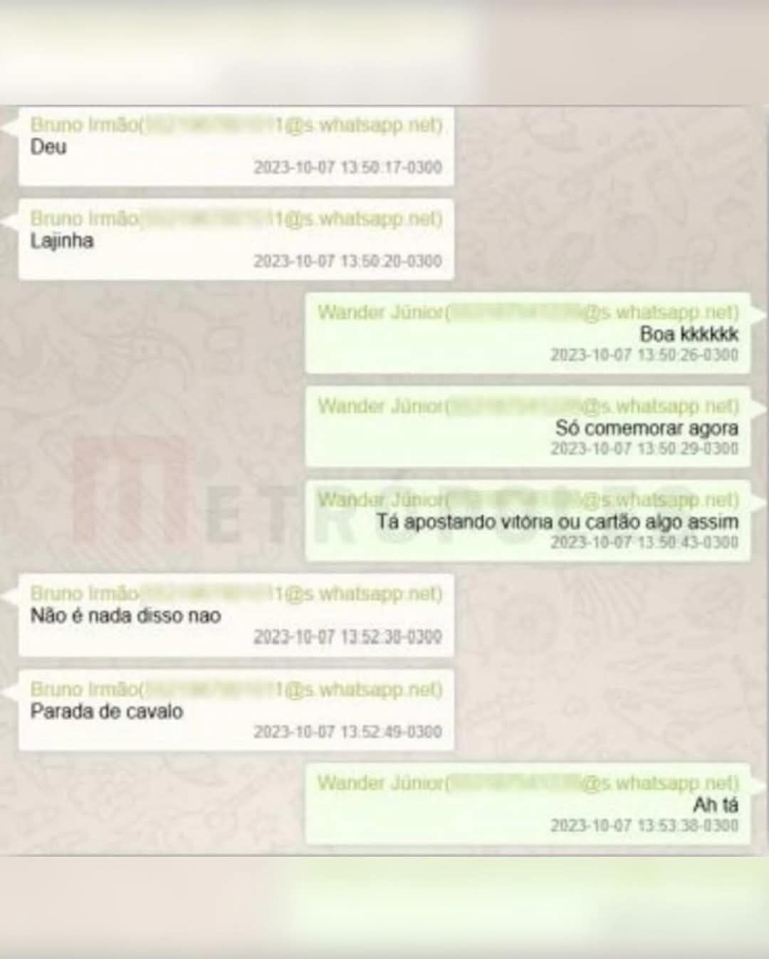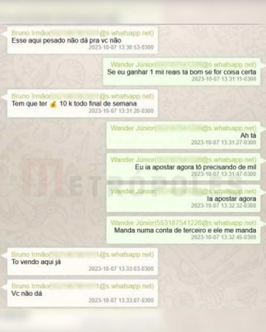 Bruno e o irmão, Wander Nunes Pinto Júnior — também alvo da operação da PF em novembro do ano passado — trocaram mensagens em 29 de agosto, quando Wander questionou o irmão sobre ele estar pendurado no Brasileirão: