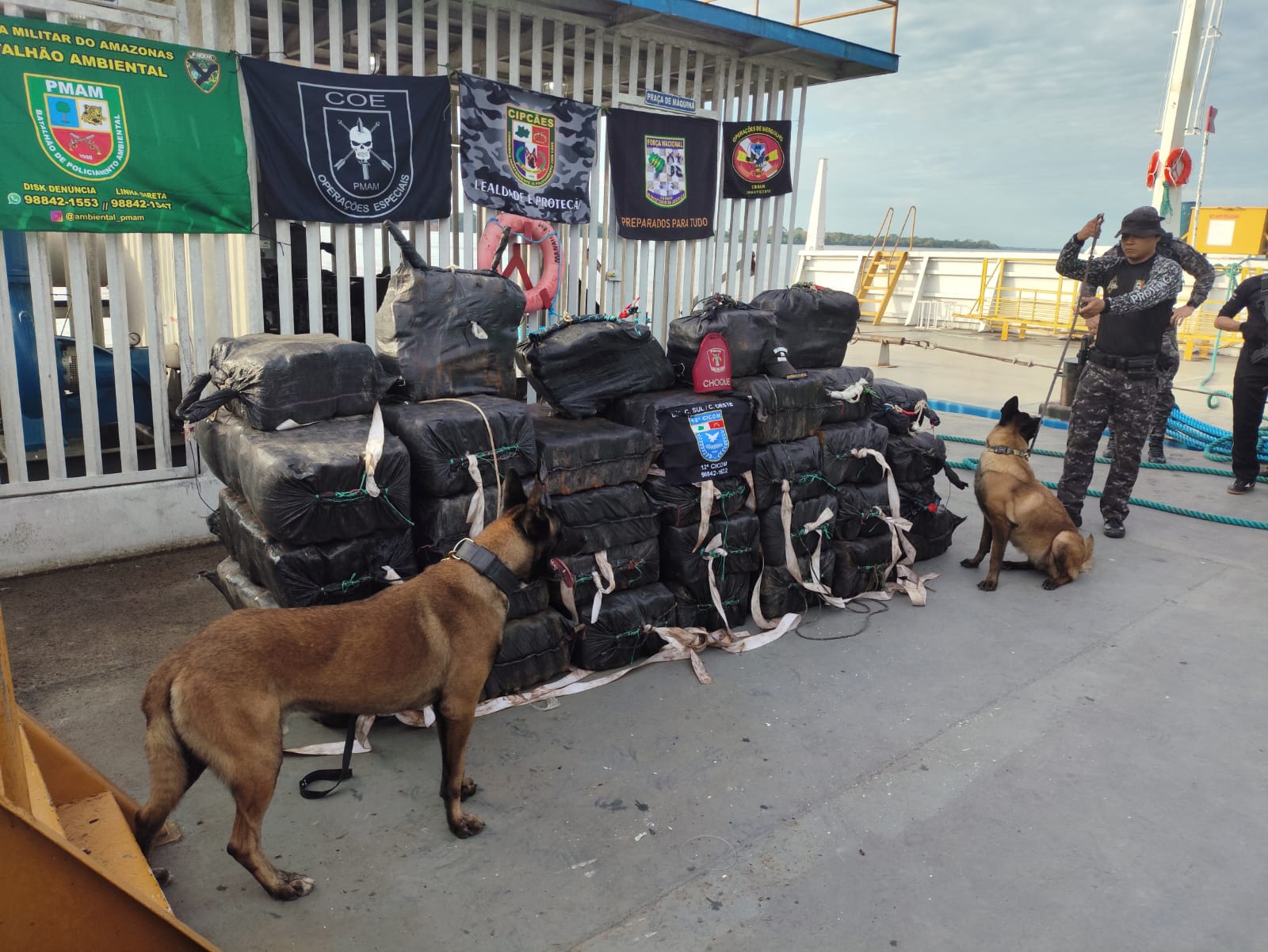 “Durante a abordagem, os cães policiais Havana e Kratus, da Companhia Independente de Policiamento com Cães (CipCães) sinalizaram a presença de entorpecentes no interior de uma das bóias dos tanques de combustível. Ao terem realizado revista minuciosa, identificaram a presença de grande volume de pacotes no interior das boias”, informou o comandante da Base Arpão 1, capitão Adaumir Diego.