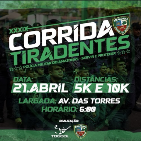 A tradicional Corrida Tiradentes, realizada anualmente pela Polícia Militar do Amazonas (PMAM), completará a sua 39ª edição, no dia 21 de abril. As inscrições, iniciadas no dia 12 de fevereiro, seguem com lote promocional até o dia 28 deste mês. O evento, que já faz parte do calendário esportivo do estado e integrará a comemoração pelos 188 anos da corporação, reúne atletas profissionais, amadores e policiais militares em uma grande celebração esportiva.