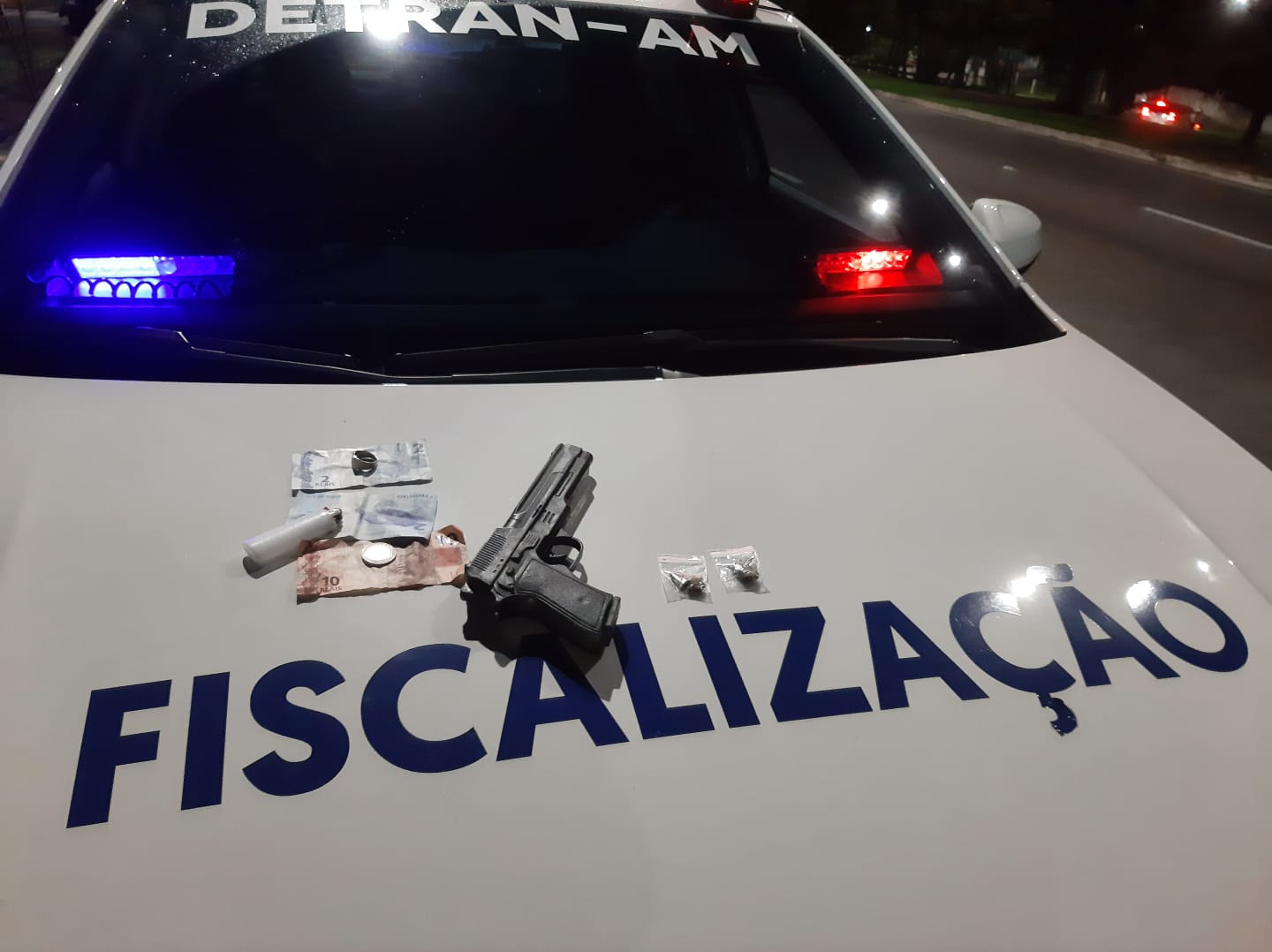 De acordo com o coordenador da Fiscalização do Detran-AM, Arthur Cruz, os indivíduos, que portavam um simulacro de arma de fogo e uma quantidade de entorpecente, foram abordados por estarem em uma motocicleta Yamaha sem placa de identificação.