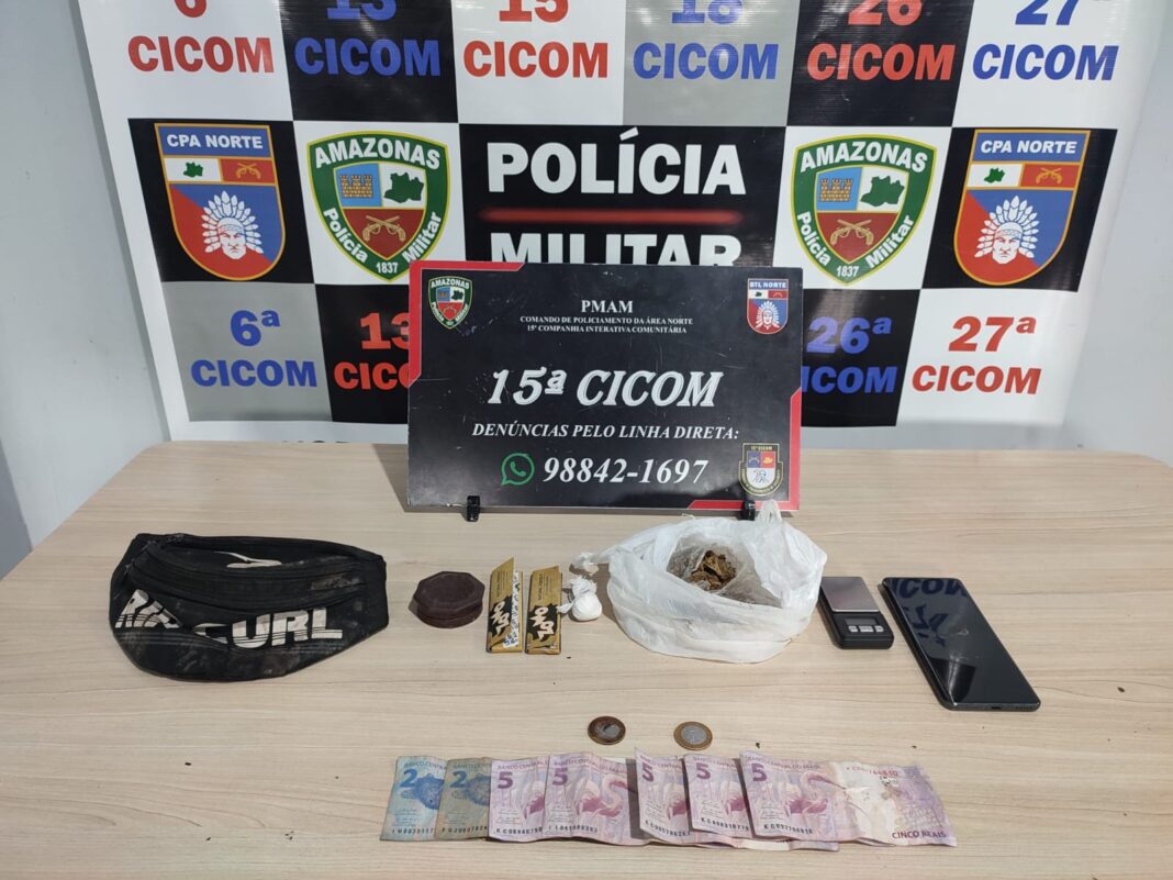 Ainda na zona norte, a equipe policial da 15ª Companhia Interativa Comunitária (Cicom) realizava patrulhamento no bairro Nova Cidade, por volta das 11h45, quando identificou um grupo de homens fugindo para uma área de mata. Após buscas no local, um suspeito foi preso com duas porções de drogas, uma balança de precisão e R$66 em espécie.