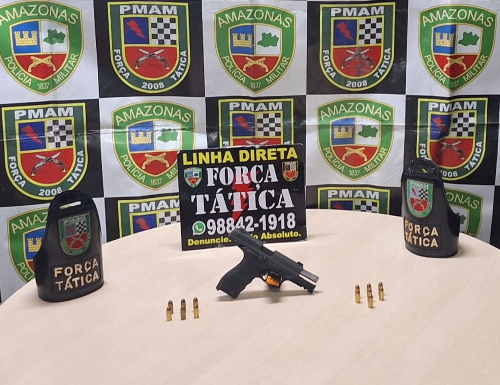 E por volta das 22h50, na zona sul, policiais militares da Força Tática receberam denúncia de que um grupo estava armado e comercializando entorpecentes no beco Canumã, bairro Petrópolis. A equipe realizou incursão no local, onde os suspeitos fugiram após perceberem a presença dos PMs. Durante as buscas, foram encontrados uma pistola calibre 40, com 13 munições e um carregador.